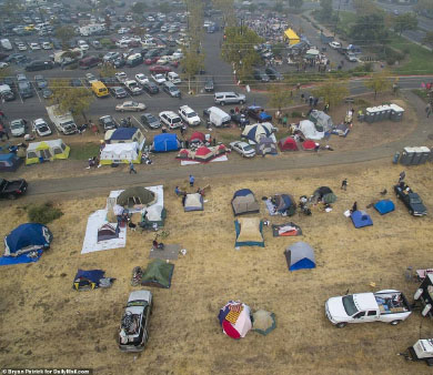 | Pictured above: is a temporary tent city setup on a Walmart parking lot, called 'Wallywood'; in Chico (Northern California) for those worst affected by the wildfires (like in Paradise town). |