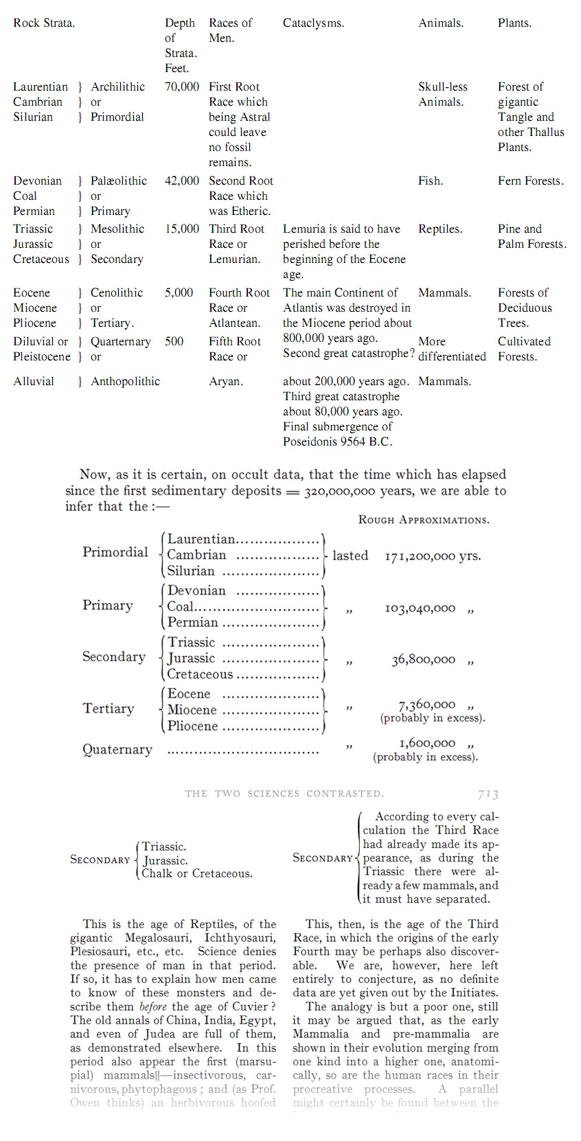 | ( "We are aware of the fact that only the boldest geologists dare to place man further back than the Miocene age. If, according to Prof. Huxley, "the time represented by the coal formation would be six millions of years, how many more millions would be required to cover the time from the Jurassic period, or the middle of the so-called "Reptilian" age (when the Third Race appeared), |