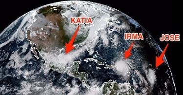 | (iv) Now Extremely Extraordinary and Rare Triple Hurricanes: Irma (reaching up to Category 5) accompanying by Jose and Katia (Category 3 hurricanes). (v) Even Hurricane Jose recently becoming a Category 4 hurricane, at sustained speeds of 150 mph (240 km/h) to destroy what remains on the smaller islands near the Caribbean Sea (Leeward Islands, Barbuda, St. Martin, Virgin Islands, etc..) as 2nd Round of destructions. 4.) This is causing worldly materialistic: experts and scientists to become stunned, shocked and clueless about how and what is happening now ??? The sudden manifestation of extraordinary, unprecedented & unusual hurricanes (like Harvey, Irma, Jose and Katia) are beyond their available measurements, computer data and earthly knowledge. |